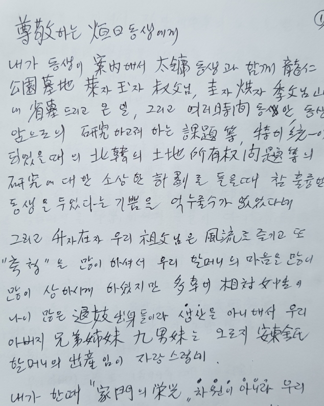 1] 본래 밀양박씨 족보 개정작업은 62세 종손 박섭용 종형이 주관하셨다. 그러나 당신이 미국에 거주하는 데다 고령인 탓에 간곡한 편지(오른쪽 사진)와 함께 그동안 수집 보관해온 각 집안의 관련자료와 사진을 필자에게 보내오셨다.