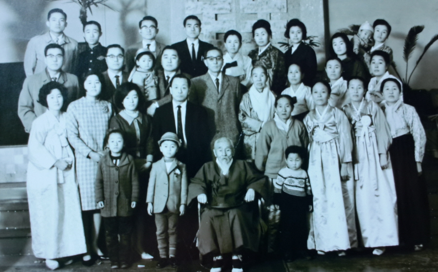升자在자 할아버지를 모시고 네 분의 아드님과 세 분의 따님이 그 자녀들과 함께 사진을 촬영하였다.